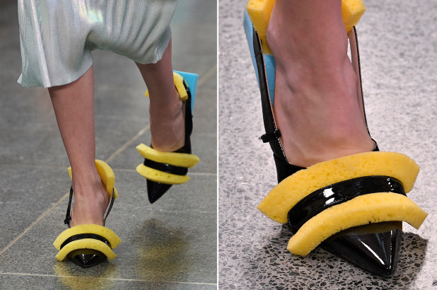អ្នករចនាម៉ូដសញ្ជាតិស្កុតឡែន លោក Christopher Kane ដែលបានធ្វើឲ្យស្បែកជើង Crocs ល្បីល្បាញកាលពីឆ្នាំមុន ឥឡូវនេះបានបង្ហាញម៉ូដស្បែកជើងដ៏ចម្លែកថ្មី ដែលត្រូវបានតុបតែងដោយបន្ទះអេប៉ុងពណ៌លឿង និងខៀវ។