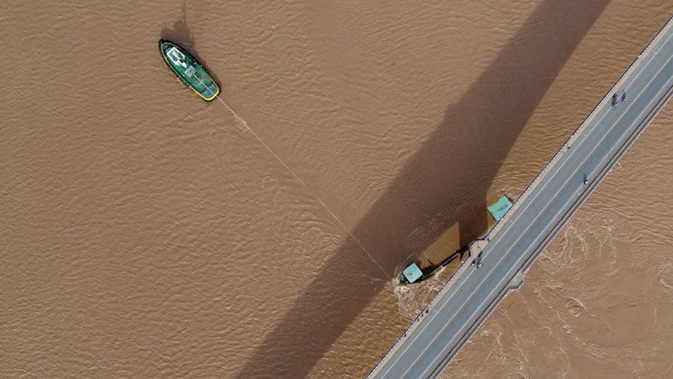 ក្រុមប្រតិបត្តិការជួយសង្គ្រោះ កំពុងដុតដៃដុតជើង ដើម្បីទាញយកសាឡង់ដឹកខ្សាច់មួយគ្រឿង ដែលបើកបុកសសរស្ពានព្រែកតាមាក់ កាលពីថ្ងៃទិត្យ ទី៨ ខែកញ្ញា ២០១៩។