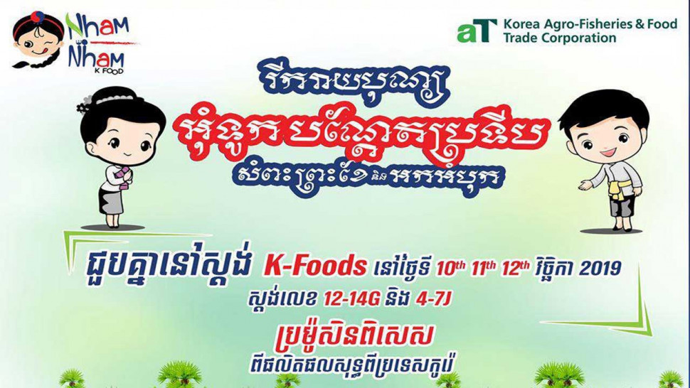កសិឧស្សាហ៍កម្ម-ជលផល និងសាជីវកម្មពាណិជ្ជកម្មអាហារកូរ៉េ (aT Korea Agro-Fisheries and Food Trade Corporation) បានសហការជាមួយគ្នាក្នុងការដាក់តាំងបង្ហាញ និងលក់ផលិតផលដ៏មានគុណភាពល្អបំផុតប្រចាំប្រទេសកូរ៉េក្នុងឱកាសព្រះរាជពិធីបុណ្យអុំទូកដែលនឹងប្រព្រឹត្តទៅចំនួន ៣ ថ្ងៃ ចាប់ពីថ្ងៃទី ១០ ដល់ ១២ ខែវិច្ឆិកា ឆ្នាំ ២០១៩ នេះ។