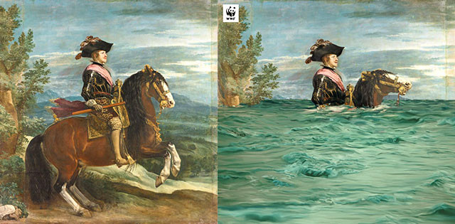 ១. រូបគំនូរស្ដេច Felipe IV ជិះសេះ ត្រូវបានកែច្នៃដើម្បីបង្ហាញពីការឡើងនៃកម្ពស់ទឹកសមុទ្រ