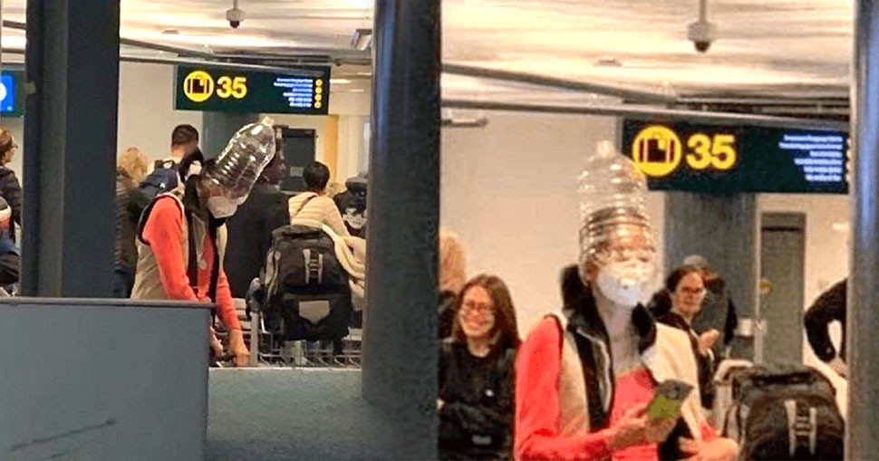 ហួសចិត្ត! ខ្លាចឆ្លងវីរុសកូរ៉ូណាពេក ស្ត្រីម្នាក់យកដបទឹកគ្របក្បាល នៅព្រលានយន្ដហោះ
