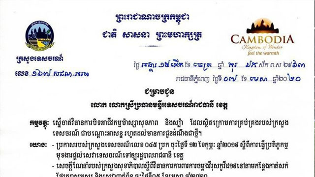 នៅក្នុងថ្ងៃនេះដែរ ក្រសួងទេសចរណ៍បានជូនដំណឹងដល់ប្រធានមន្ទីរទេសចរណ៍គ្រប់រាជធានី ខេត្ត ដោយស្នើឲ្យបិទអាជីវកម្មម៉ាស្សាសុខភាព និងស្ប៉ាទាំងអស់ ដែលក្រោមការគ្រប់គ្រងរបស់ក្រសួង រហូតដល់មានការជូនដំណឹងសារជាថ្មី។