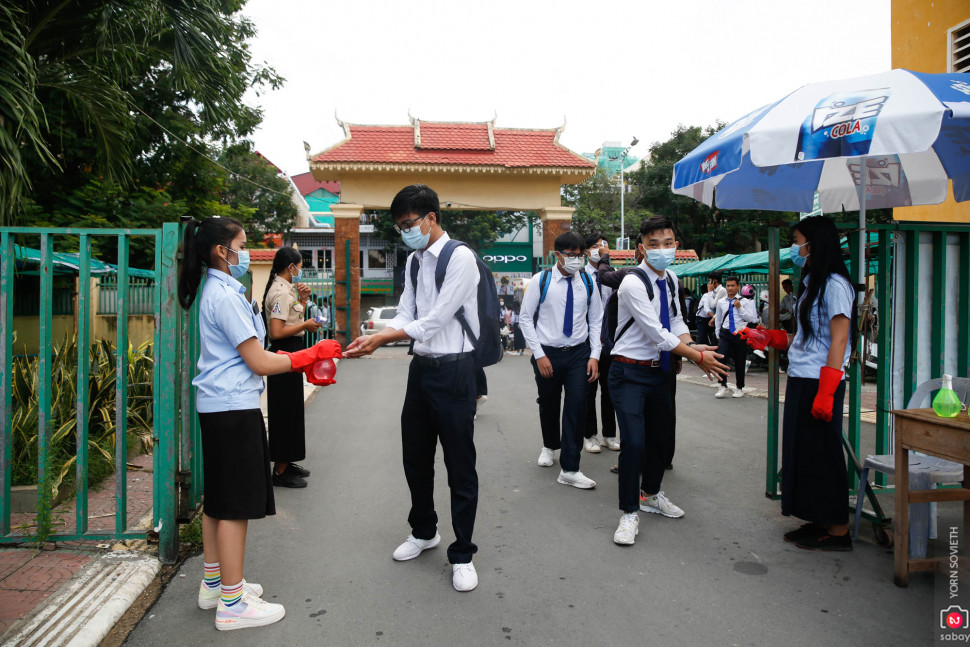 ការបើកសាលារៀនឡើងវិញនៅព្រឹកនេះ យើងសង្កេតឃើញថា នៅតាមសាលារដ្ខនិមួយៗ មានការពិនិត្យសុខភាព យ៉ាងហ្មត់ចត់ ដោយមានការវាស់កំដៅ និងលាងដៃដោយអាល់កុល នៅមុខក្លោងទ្វារចូលសាលា។