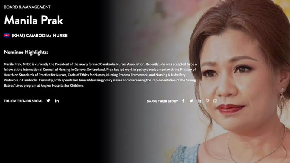 លោកស្រី ប្រាក់ ម៉ានីឡា ជាប់ជាស្រ្តីឆ្នើមនៅលើពិភពលោក ក្នុងភាពជាអ្នកដឹកនាំគិលានុបដ្ឋាក និងឆ្មប