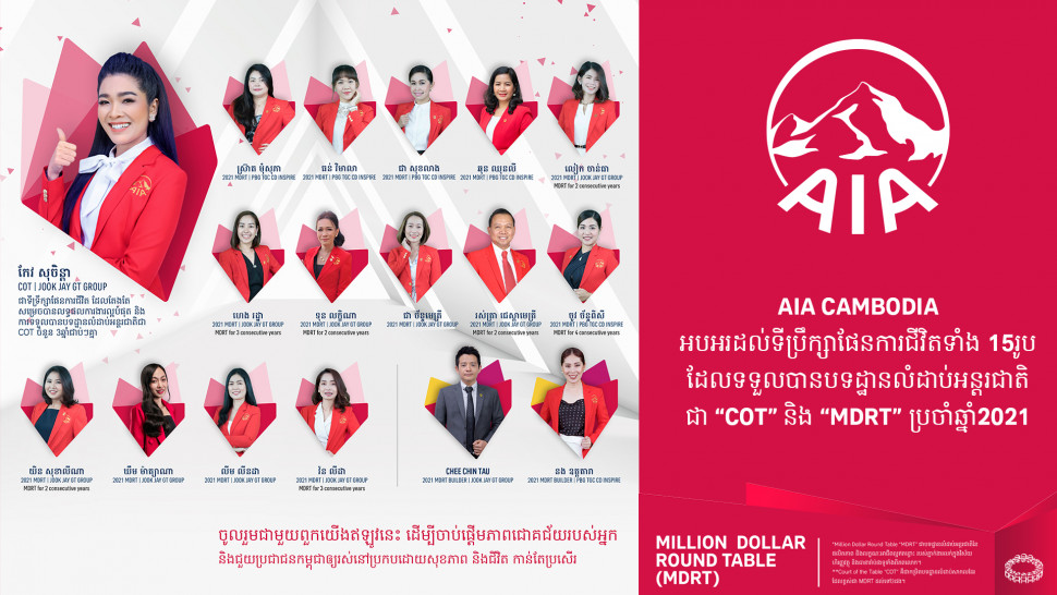AIA Cambodia អបអរដល់ទីប្រឹក្សាផែនការជីវិតទាំង១៥រូបដែល ទទួលបានបទដ្ឋានលំដាប់អន្តរជាតិជា “COT” និង “MDRT” ប្រចាំឆ្នាំ២០២១