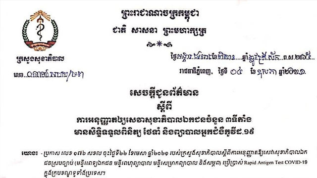 អម្បាញ់មិញនេះ ក្រសួងសុខាភិបាលបានសេចក្ដីព័ត៌មានស្ដីពី ការអនុញ្ញាតឲ្យសេវាសុខាភិបាលឯកជនចំនួន ៣ទីតាំងមានសិទ្ធិទទួលពិនិត្យ ថែទាំ និងព្យាបាលអ្នកជំងឺកូវីដ-១៩។ បន្ថែមលើសពីនេះទៀត ក្រសួងក៏បានអនុញ្ញាតឲ្យពេទ្យឯកជនទាំង ៣កន្លែងនេះមានសិទ្ធិធ្វើតេស្តរហ័សរកអង់ទីហ្សែនកូវីដ-១៩ ផងដែរ។