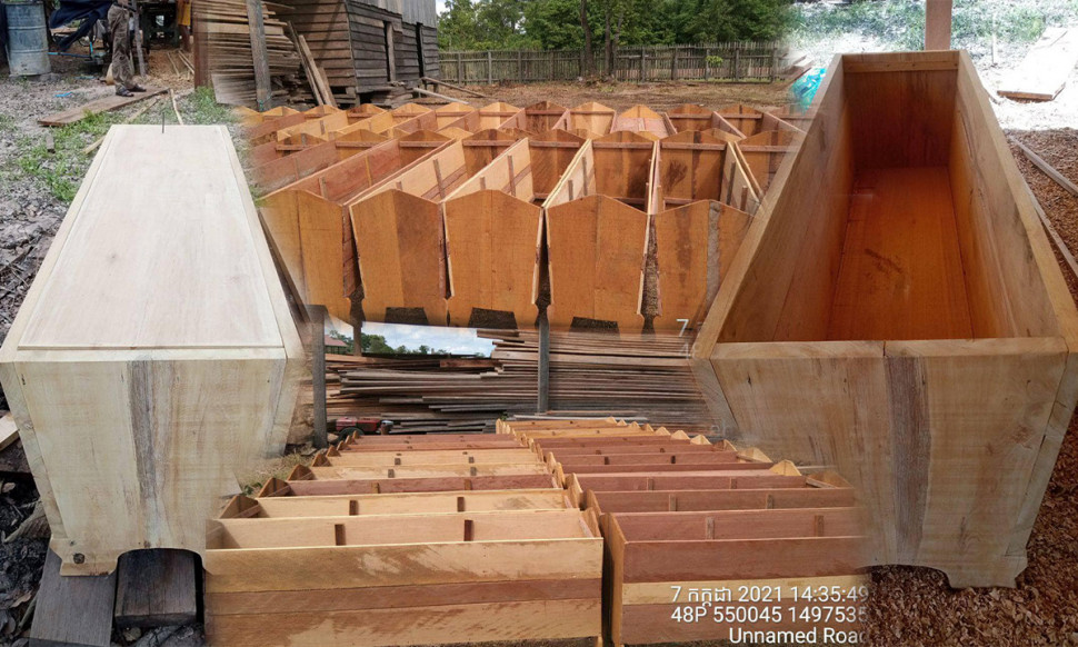 ច្រើនសន្លឹក កន្លែងផលិតក្ដារមឈូស រឹបអូសបានពីការជួញដូរព្រៃឈើ ត្រៀមដាក់សពស្លាប់ដោយសារកូវីដ