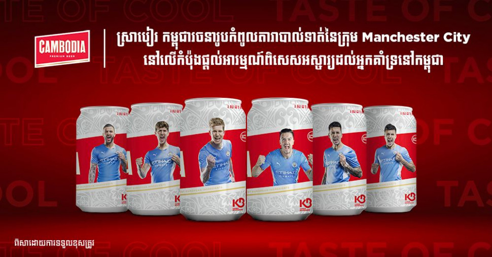 អ្នកស្រី គង់ កុសល នាយិកាផ្នែកទីផ្សារក្រុមហ៊ុន ខ្មែរ ប៊ែវើរីជីស នៅថ្ងៃទី២២ ខែធ្នូ ឆ្នាំ២០២១ បានឲ្យដឹងថា ក្រុមហ៊ុនបានរចនារូបភាពកំពូលតារាបាល់ទាត់លំដាប់ពិភពលោករបស់ក្រុមដ៏ល្បីនៅចក្រភពអង់គ្លេស Manchester City នៅលើសំបកវេចខ្ចប់កំប៉ុងស្រាបៀរ កម្ពុជា ដើម្បីផ្តល់អារម្មណ៍ពិសេសជូនដល់អ្នកគាំទ្រនៅកម្ពុជា។