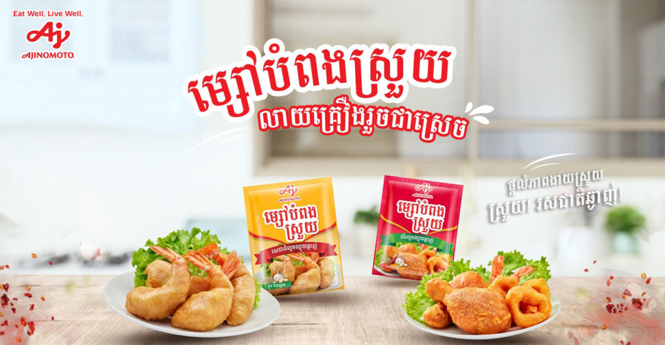 ថ្មីៗនេះ ក្រុមហ៊ុន អាជីណូម៉ូតូ (ខេមបូឌា) បានចេញលក់ផលិតផលថ្មី គឺ ប្រភេទម្សៅបំពង ដែលមានលាយគ្រឿងទេសជាច្រើនមុខឲ្យមានរសជាតិល្មមរួចជាស្រេច ដែលជួយផ្តល់ភាពងាយស្រួលសម្រាប់ចម្អិន និងធ្វើឲ្យមុខម្ហូបបំពងស្រួយ ឆ្ងាញ់ជាប់មាត់។ ម្សៅបំពងស្រួយ ស័ក្តសមសម្រាប់ស្ត្រីមេផ្ទះដែលចូលចិត្តធ្វើម្ហូបបែបបំពង ។