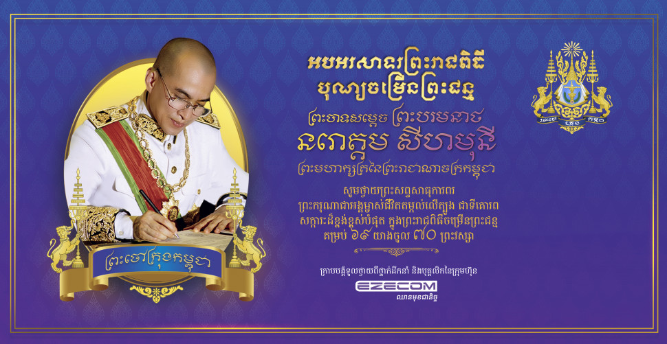 ថ្នាក់ដឹកនាំ និងបុគ្គលិកនៃក្រុមហ៊ុន Ezecom ទាំងអស់ សូមក្រាបថ្វាយព្រះពរព្រះករុណាព្រះបាទសម្ដេចព្រះបរមនាថ នរោត្តម សីហមុនីនាឱកាសដ៏មហានក្ខត្តឫក្សឧត្តុង្គឧត្តមនៃព្រះរាជពិធីបុណ្យចម្រើនព្រះជន្មគម្រប់៦៩ យាងចូល ៧០ ព្រះវស្សា