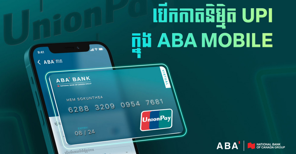 ដើម្បីដឹងបន្ថែមពីរបៀបបើកកាតនិម្មិត UnionPay ក្នុង ABA Mobile សូមចូលទៅទំព័រ កាតនិម្មិត ។ មិនទាន់មានគណនី ABA មែនទេ? ដោនឡូតកម្មវិធី ABA Mobile ហើយបើក គណនីរហ័ស ឥឡូវ (ត្រូវមានអត្តសញ្ញាណប័ណ្ណ និងលេខទូរស័ព្ទ)៕