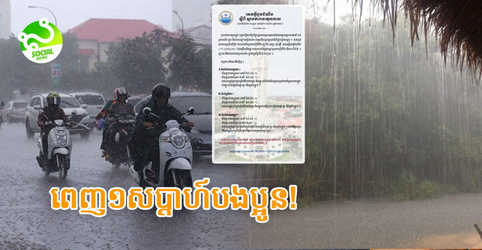 តាមការជូនដំណឹងបានឲ្យដឹងថា ក្នុងរង្វង់១សប្ដាហ៍នេះ ព្រះរាជាណាចក្រកម្ពុជា ទទួលឥទ្ធិពលពីប្រព័ន្ធសម្ពាធទាបអូសបន្លាយលើអាងទន្លេមេគង្គភាគខាងលើ កាត់ ប្រទេសថៃ ឡាវ និងភាគកណ្តាលវៀតណាម ជាមួយនិងខ្យល់មូសុងនិរតីក្នុងកម្រិតមធ្យម ។