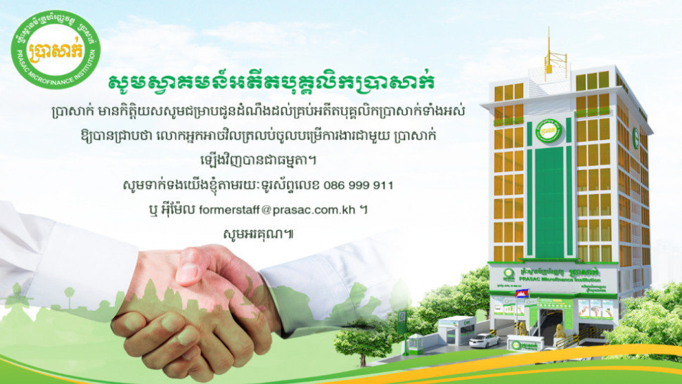 ប្រាសាក់ ជាគ្រឹះស្ថានហិរញ្ញវត្ថុធំមួយនៅកម្ពុជា ដែលមានបុគ្គលិកជាង ៨ ០០០នាក់កំពុងបម្រើការ បានប្រកាសថា ខ្លួនស្វាគមន៍គ្រប់អតីតបុគ្គលិកប្រាសាក់ទាំងអស់ ដែលមានបំណងចូលបម្រើការងារនៅប្រាសាក់វិញ ដោយគ្រឹះស្ថានរីករាយក្នុងការទទួលយកអតីតបុគ្គលិកទាំងអស់ មកចូលរួមបម្រើការជាមួយនឹងមហាគ្រួសារប្រាសាក់។