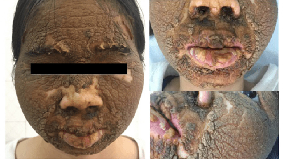 ដោយសារតែមានស្បែកមិនស ទើបនារីរូបនេះសម្រេចចិត្តទិញផលិតផលដើម្បីប្តូរពណ៌សម្បុរ។ ប៉ុន្តែទីបំផុត ស្បែកមុខក៏ប្រែទៅជាក្រាស់ ចេញពណ៌ខ្មៅ រឹងដូចសំបកក្រូច។