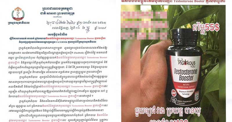 ក្រសួងសុខាភិបាលនៅថ្ងៃនេះបានចេញសេចក្ដីជូនដំណឹងមួយស្ដីពីការហាមឃាត់ ការលក់ ឬចែកចាយឱសថបំប៉នផ្លូវភេទបុរសមួយប្រភេទមានឈ្មោះថា Testosterone Booster ដោយថាឱសថនេះមិនមានបញ្ជិការ និងមានការផ្សាយបំផ្លើសការពិតគ្មានមូលដ្ឋានវិទ្យាសាស្ត្រត្រឹមត្រូវ។
