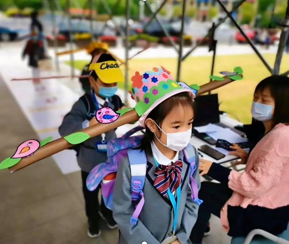 មើលទៅស្អាតប្លែកម្យ៉ាង ពាក់មួករក្សាគម្លាត១ម៉ែត្រ ការពារការចម្លងកូវីដ នៅសាលារៀនមួយរបស់ចិន