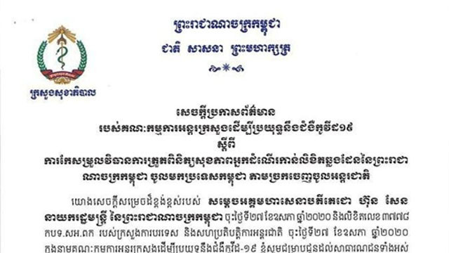 ក្រសួងសុខាភិបាលបានចេញសេចក្ដីប្រកាសព័ត៌មានស្ដីពី ការកែសម្រួលវិធានការត្រួតពិនិត្យសុខភាពចំពោះអ្នកកាន់លិខិតឆ្លងដែននៃព្រះរាជាណាចក្រកម្ពុជា ក្នុងការចូលប្រទេសវិញ។
