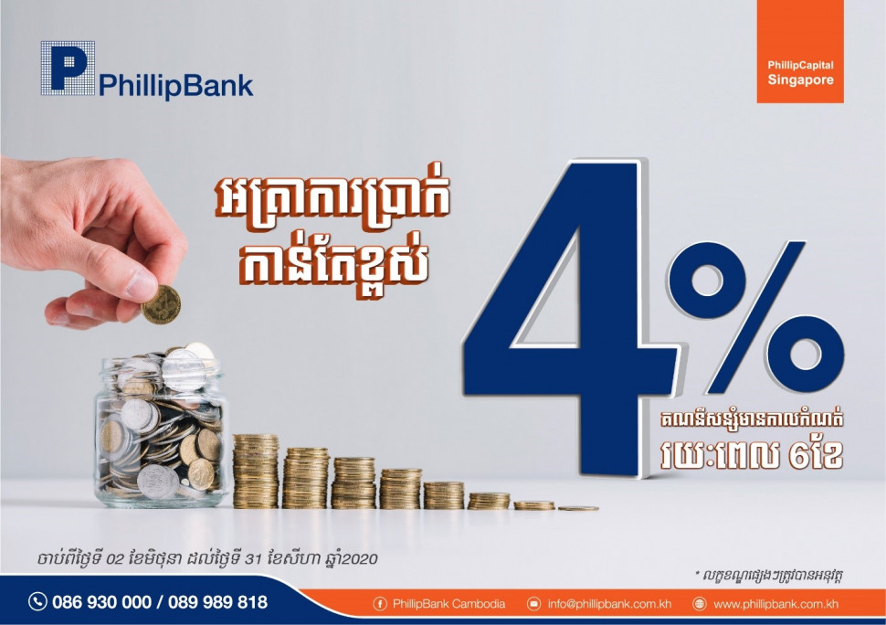 យើងខ្ញុំសូមណែនាំនូវគណនីគណសន្សំមានកាលកំណត់របស់ ធនាគារ ហ្វីលីព។ គ្រាន់តែបើកគណសន្សំមានកាលកំណត់ក្នុងថ្ងៃនេះ លោកអ្នកនឹងទទួលបានអត្រាការប្រាក់ពិសេស ដល់ទៅ ៤% សម្រាប់រយៈពេល ៦ខែ។