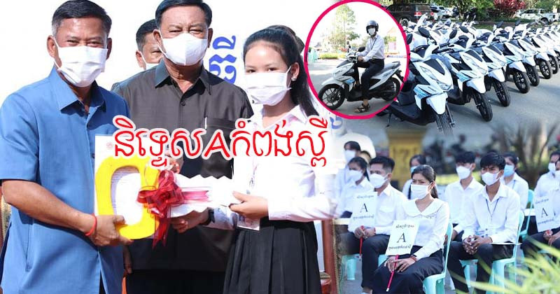តាមការសន្យានាព្រឹកថ្ងៃទី២៤ ខែមករា ឆ្នាំ២០២២នេះ ឯកឧត្តម វ៉ី សំណាង អភិបាលខេត្តកំពង់ស្ពឺបាន បានប្រគល់ហើយនូវម៉ូតូហុងដា ម៉ាក beat 110 ស៊េរី ២០២២ថ្មីស្រឡាង ចំនួន៣៣គ្រឿង ដល់បេក្ខជនសិស្សឆ្នើមនិទ្ទេស A ចំនួន៣៣នាក់ នៅក្នុងខេត្តកំពង់ស្ពឺ ដែលបានប្រឡងជាប់សញ្ញាបត្រមធ្យមសិក្សាទុតិយភូមិ នាសម័យប្រឡង ២៧ ធ្នូ ២០២១។