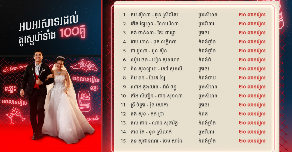សូមចូលរួមអបអរសាទរគូស្វាមីភរិយាថ្មីចំនួន១០០គូ មកពីខេត្តក្រចេះ ខេត្តព្រះសីហនុ ខេត្តកំពង់ឆ្នាំង ខេត្តកំពត ខេត្តព្រះវិហារ ខេត្តស្វាយរៀង និងខេត្តជាច្រើនផ្សេងទៀតដែលមានសំណាងឈ្នះទឹកប្រាក់សុទ្ធចំនួន១០លានរៀល និង២០លានរៀលពីការចាប់រង្វាន់របស់ស្រាបៀរ កម្ពុជា ដែលបានធ្វើឡើងកាលពីថ្ងៃសៅរ៍ ទី៣០ ខែមេសា ក្នុងកម្មវិធីប្រគុំតន្ត្រី BREW THE BEAT CONCERT នៅលើកញ្ចក់ទូរទស្សន៍ហង្សមាស។