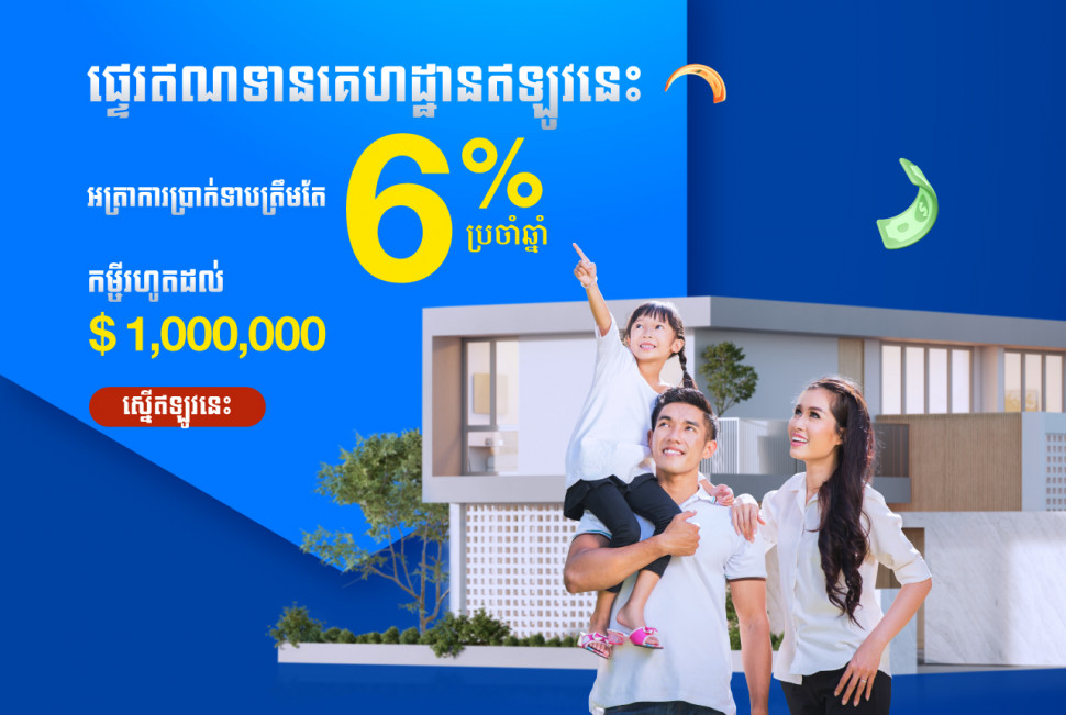 ការផ្តល់ជូនពិសេសនេះសម្រាប់អតិថិជនដែលមានឥណទានគេហដ្ឋានស្រាប់ជាមួយស្ថាប័នហិរញ្ញវត្ថុណាមួយ។ ការផ្តល់ជូននេះមានសុពលភាពចាប់ពីថ្ងៃនេះរហូតដល់ថ្ងៃទី31 ខែមីនា ឆ្នាំ 2023។