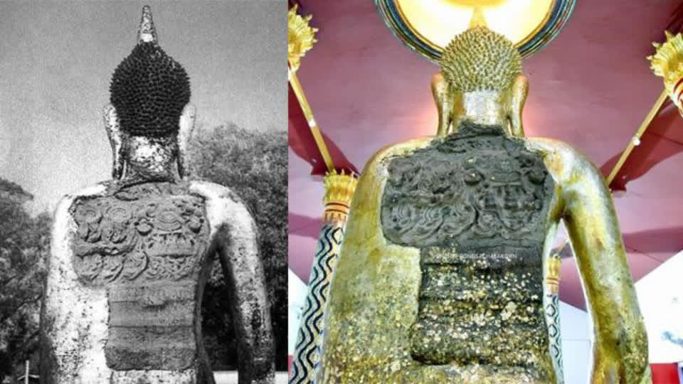 ផ្ដែរប្រាសាទរចនាបថខ្មែរ លេចឡើងលើខ្នងព្រះពុទ្ធបដិមាថៃយ៉ាងចម្លែក ដោយមិនដឹងមូលហេតុច្បាស់លាស់